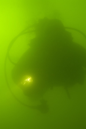 Wir paddelten gut 45 Minuten unter dem Bootssteg herum. Wenn man die Arme nach unten nahm, hatte man auch mal 1,5 Meter Tiefe auf dem Tauchcomputer. Tauchen konnte man das wirklich nicht nennen. ![]() Etwas mehr Tiefe hatten wir zwischen dem Ein- / Ausstieg an der Slip-Anlage und dem Bootssteg. Wir tauchten dort in 5-6 Metern Tiefe über sandigem Grund ohne Bewuchs. Direkt in Grundnähe war die Sicht dann auch etwas besser. So einen Meter. :-)