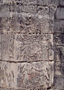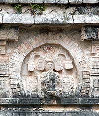 An vielen Gebäuden findet man Bilder mit tiefer religiöser Bedeutung. Mal ist es eine Verschmelzung von Gott zum Tier (Adler und Schlange) oder gar eine dämonisch aussehende Maske eines Gottes. Auch der Jaguar spielt eine wesentliche Rolle und wurde immer wieder dargestellt. |